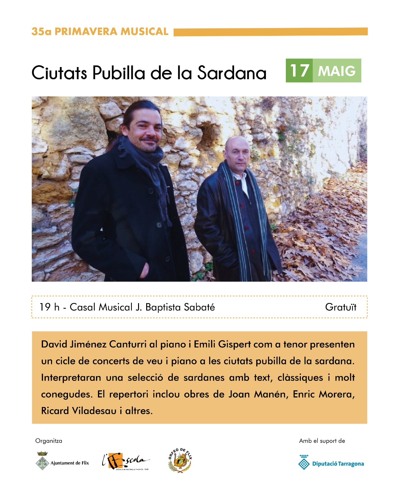 16/05/25Continuant amb els actes de la 35a Primavera Musical, us convidem dissabte dia 17 de maig a un dels cicles de concerts de Ciutats Pubilla de la Sardana, on David Jiménez Canturri al piano i Emili Gispert com a tenor interpretaran una selecció de sardanes amb text, clàssiques i molt conegudes.
