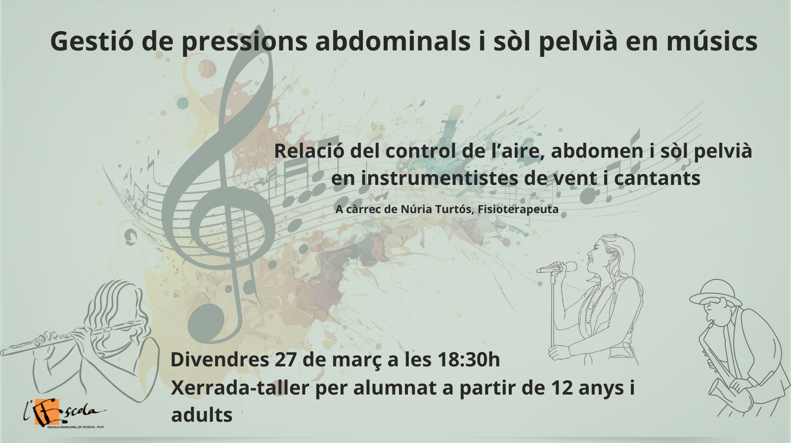 La xerrada anirà a càrrec de Núria Turtós, fisioterapeuta, i està adreçada a alumnes a partir de dotze anys i adults que toquin instruments de vent o facin classes de cant.