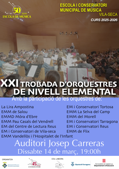 ola participarà en la 21a Trobada d’Orquestres de Nivell Elemental de Vila-seca, una iniciativa que reuneix alumnes de diferents escoles de música del territorI. Després de diverses setmanes de preparació als seus centres, prop de 190 alumnes pujaran a l’escenari dissabte 14 de març a l’Auditori Josep Carreras. Els estudiants estaran repartits en tres orquestres que interpretaran conjuntament el repertori treballat.
