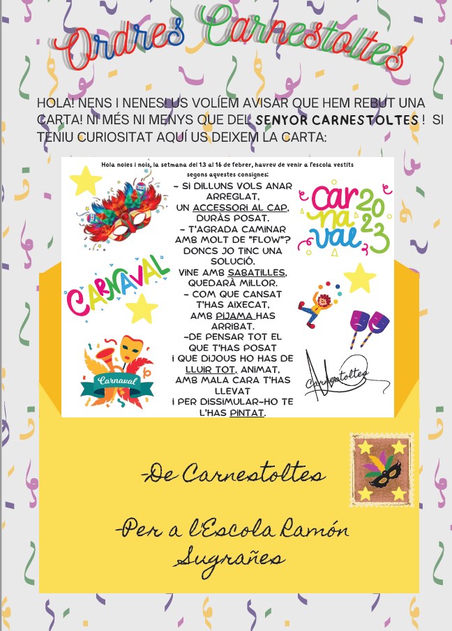 El Rei Carnestoltes ens va donar unes ordres i vam anar per totes les classes a comunicar-les: aquesta setmana de carnaval hem tingut batukada a totes hores i balls (Carnestoltes quinze voltes, Volcans, El supermercat…). Festa, música, ball i alegria per Carnaval!
