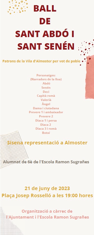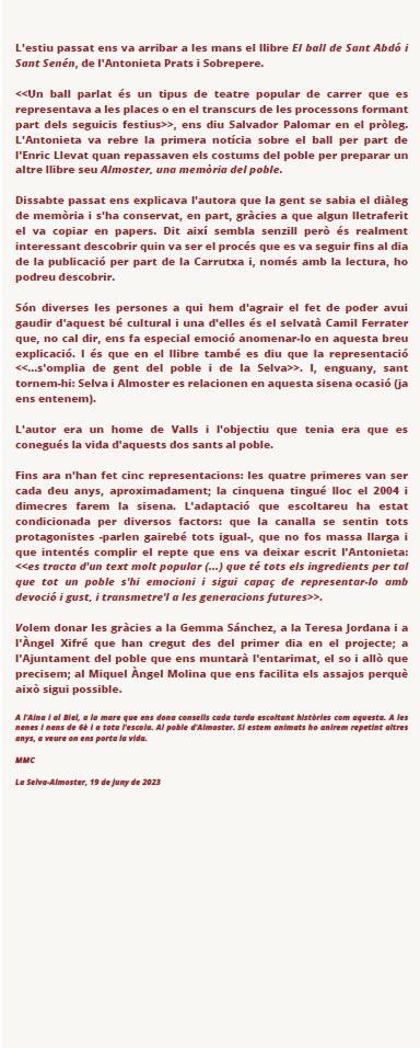 Ahir els alumnes de 6è de la nostra escola dirigits per la mestra Maria Massana, van representar el “Ball parlat de Sant Abdó i Sant Senén” a la plaça Josep Rosselló del poble.