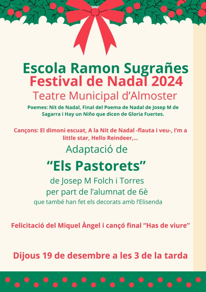 Una vegada més, el Festival de Nadal de l’escola Ramon Sugrañes va ser un moment de trobada entranyable en el que l’alumnat van demostrar que són uns artistes. Van recitar poemes (educació infantil Nit de Nadal – popular- i educació primària el Final del Poema de Nadal de Josep M. de Sagarra), cantar cançons, tocar la flauta i ens van animar amb els balls.