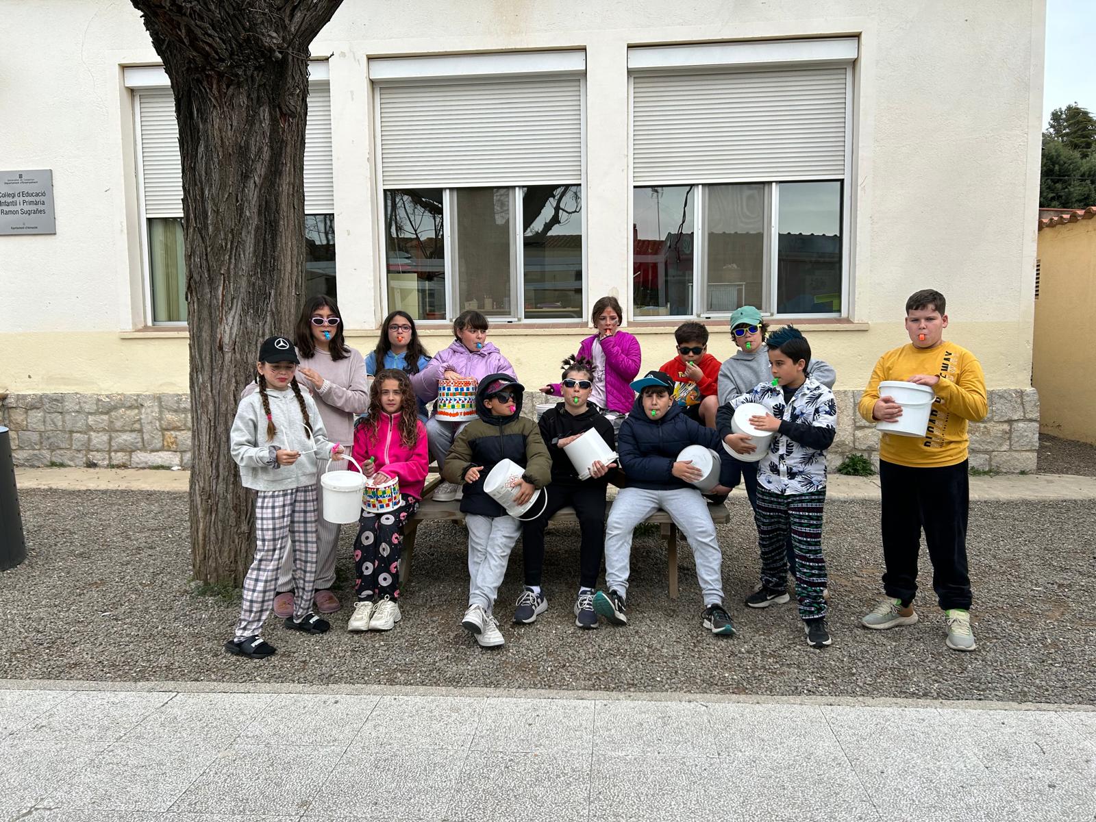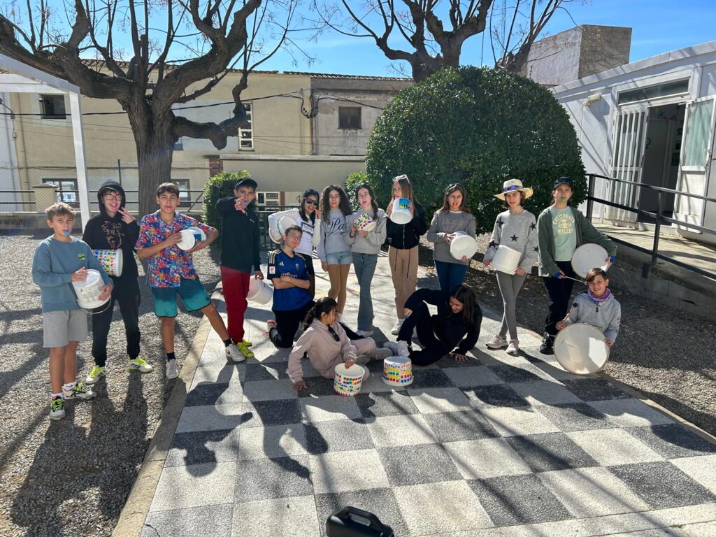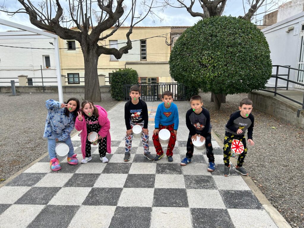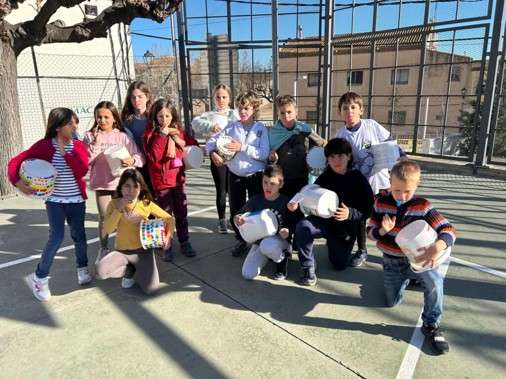Amb timbals casolans i xiulets hem pogut aprofundir en el treball de les figures amb tot l’alumnat. A ritme de negres, corxeres o semicorxeres ens hem mogut i tocat acompanyades amb instruments de percussió i de vent. En cadena o individualment, d’una manera diferent, hem aprofitat el pati i les ordres del Rei Carnestoltes per treballar aquest aspecte del llenguatge musical en una setmana molt divertida.