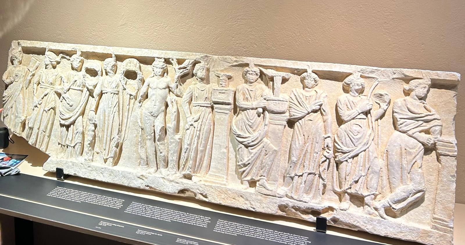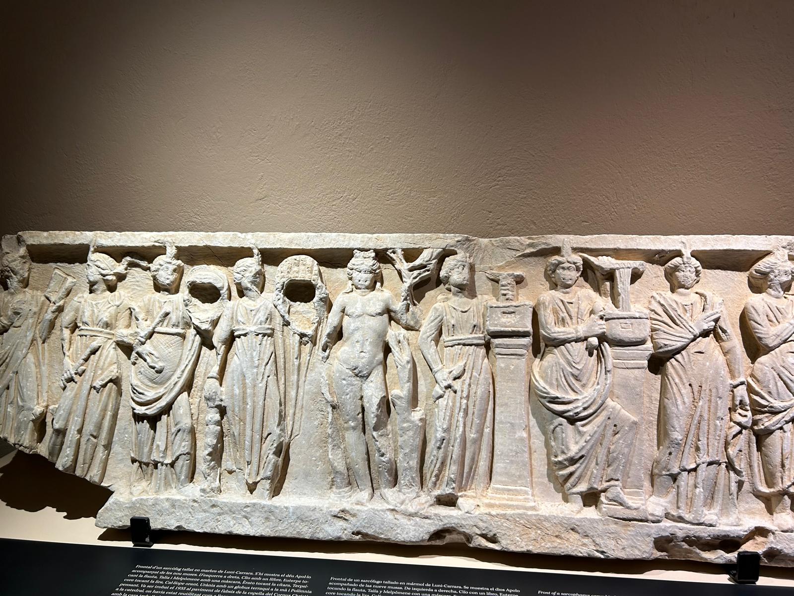 Frontal d’un sarcòfag tallat en marbre de Luni-Carrara. S’hi mostra el déu Apol·lo acompanyat de les nou muses. D’esquerra a dreta: Clio, Euterpe, Tàlia, Melpòmene, Apol·lo, Èrato, Terpsícore, Calíope, Urània i Polímnia. Ha estat datat cap a l’any 200 dC. Va ser trobat en 1935 al paviment de l’absis de la capella del Corpus Christi, a la catedral, on havia estat reutilitzat com a llosa sepulcral de la família Rocabertí, amb la cara treballada girada cap al terra.