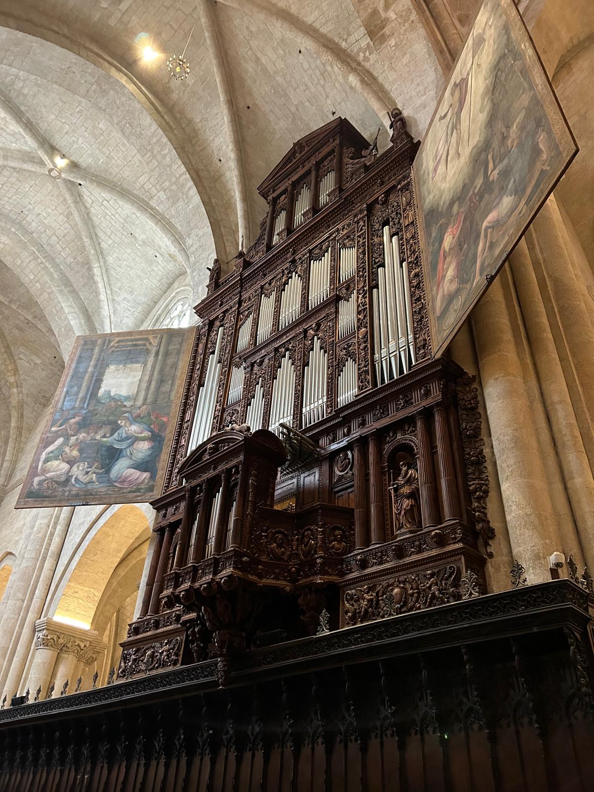 Vam recórrer el claustre sense tenir claustrofòbia per arribar a la pinacoteca on vam observar pintures amb pneumes (les antigues notes musicals, que només donaven indicacions sobre l’altura de les notes amb ritme lliure) cantats pels monjos a l’època medieval mentre miraven el tetragrama (espai per dibuixar els pneumes format per 4 línies horitzontals, diferents de les 5 línies que té el pentagrama que fem servir actualment). També tocaven el sac de gemecs per interpretar les notes inventades per Guido d’Arezzo. En acabat, vam entrar a la sagristia amb la necessitat de mirar amunt per poder admirar les pintures del sostre que ens va deixar l’art mudèjar: la cabra tocant el flabiol i el tamborí per espantar el llop i un grapat de dibuixos relatant històries. La part final va ser davant de l’orgue amb una audició enregistrada de la Tocata i fuga de Bach acompanyant-nos. Continuarem amb la manualitat de l’orgue més petit del món i sortint per la porta gran, en sentit literal i figurat, es va acabar la música.