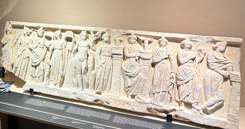 Durant tot el recorregut les audicions, pintures i escultures serviren per descobrir aspectes de la història sonora. L’observació del frontal d’un sarcòfag, obra de Luni-Carrara, on el déu de les arts Apol·lo estava acompanyat de les 9 muses ens va mostrar els instruments que sonaven a l’antiguitat. Euterpe, la musa de la música, porta un aulós: dues flautes que tocava alhora un mateix intèrpret, tant de l’antiga Grècia com de Roma. Amb tot, aquestes dues cultures veien aquesta manifestació de manera diferent: pels grecs era ciència i art indispensable per l’educació de l’home i, els romans, la consideraven un entreteniment i espectacle present en molts esdeveniments socials. Tàlia, la musa de la comèdia, i Melpòmene, musa de la tragèdia, apareixen amb una màscara.