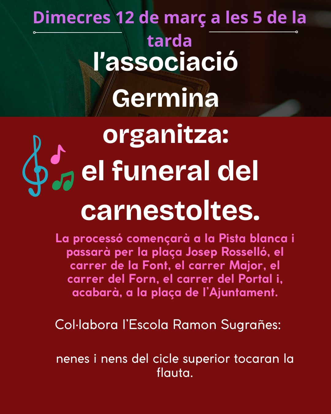 L’Escola Ramon Sugrañes va participar en el funeral del carnestoltes d’Almoster convidada per l’associació Germina. 14 nenes i nens del cicle superior van interpretar amb la flauta dolça El testament d’Amèlia, que van assajar a les sessions de música durant diverses setmanes.
