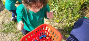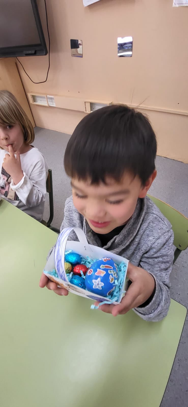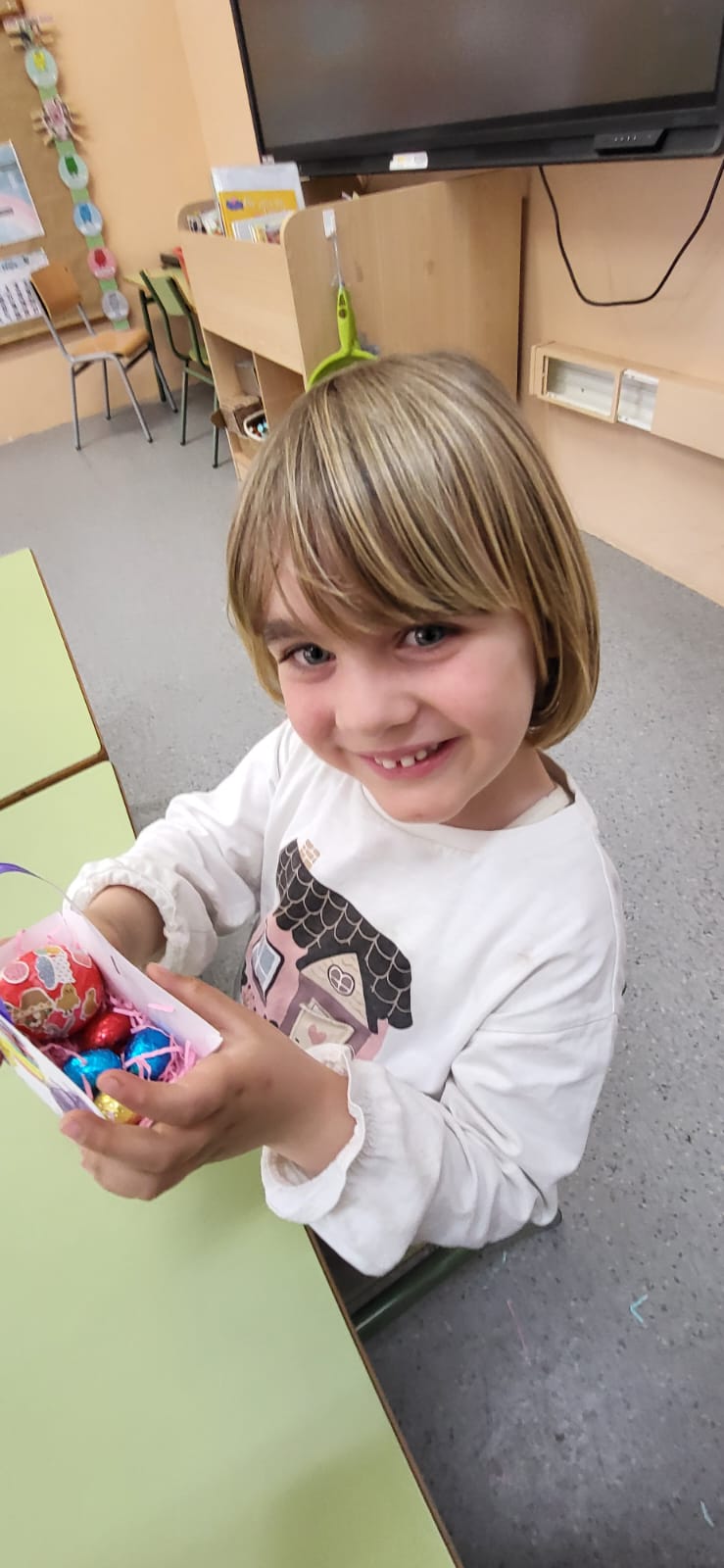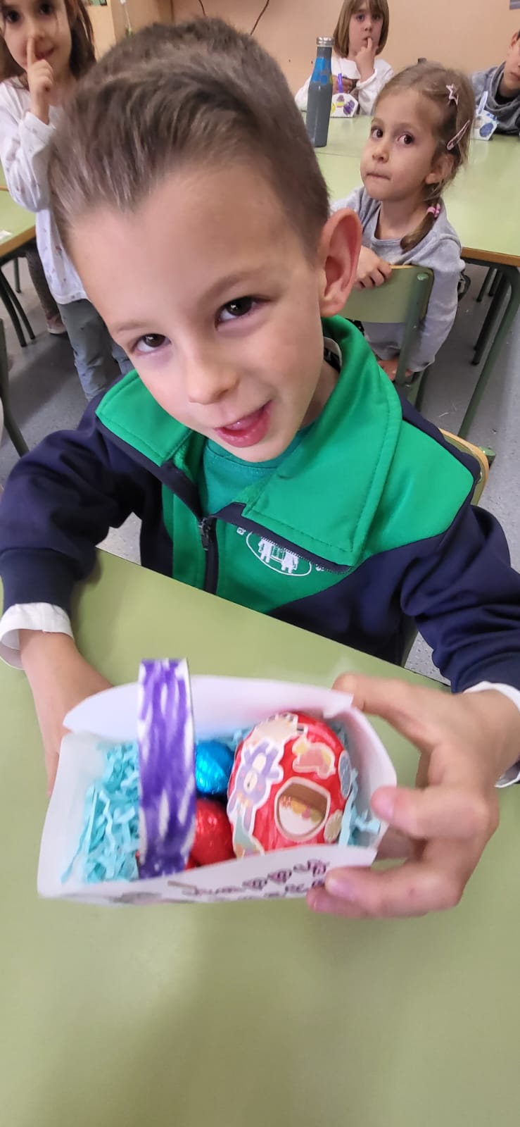 Com molt bé diu la cançó… «There is a rabbit with a pink nose, floppy ears and a fluffy tail… and bunny is his name!». L’Easter bunny ens ha tornat a fer una visita aquest any i s’ha dedicat a amagar ous de xocolata per l’escola. Hem trobat ous a la classe, a l’hort, al pati… i ens els hem emportat a les nostres Easter baskets per tenir una dolça Happy Easter! Enjoy!