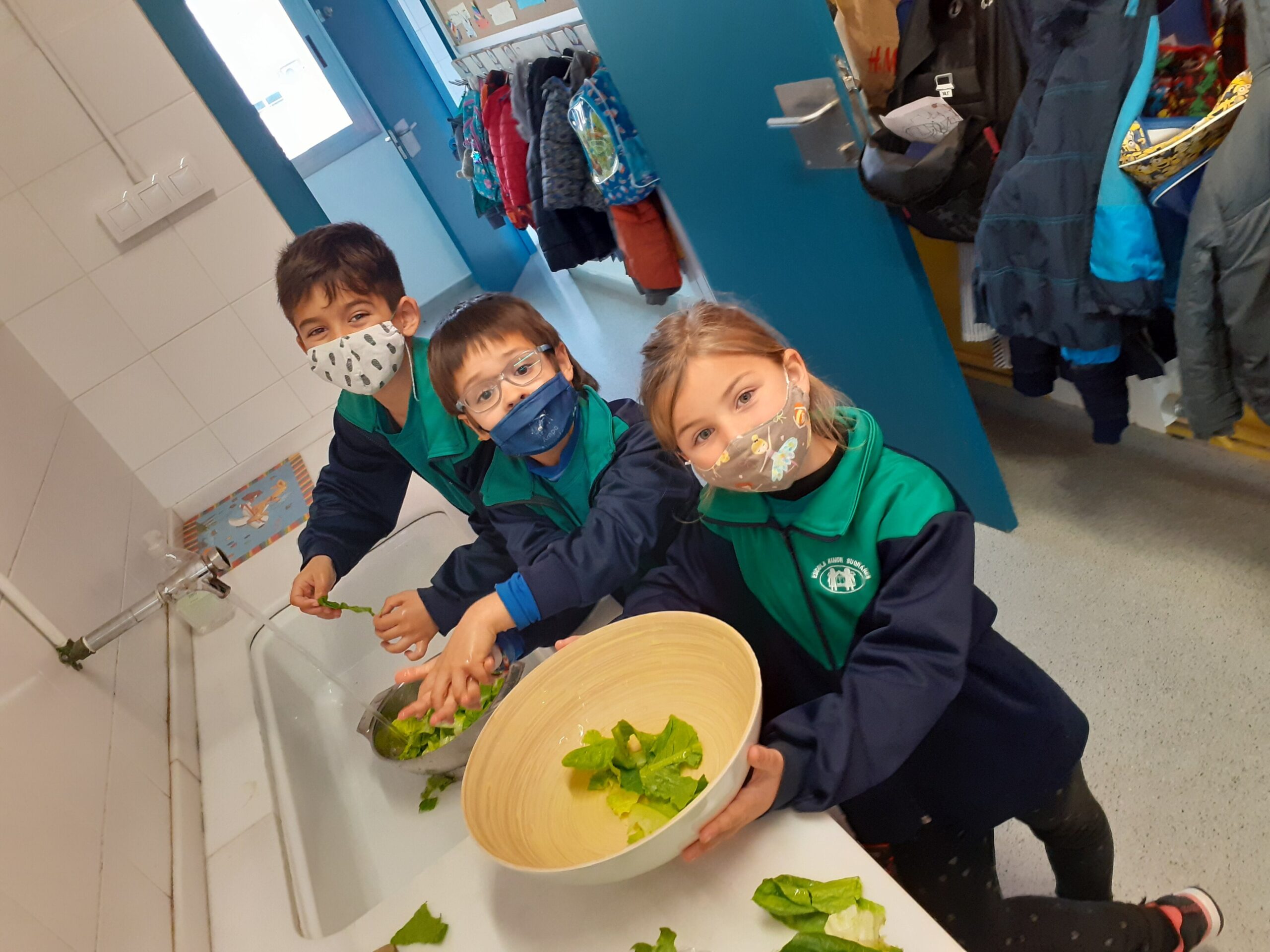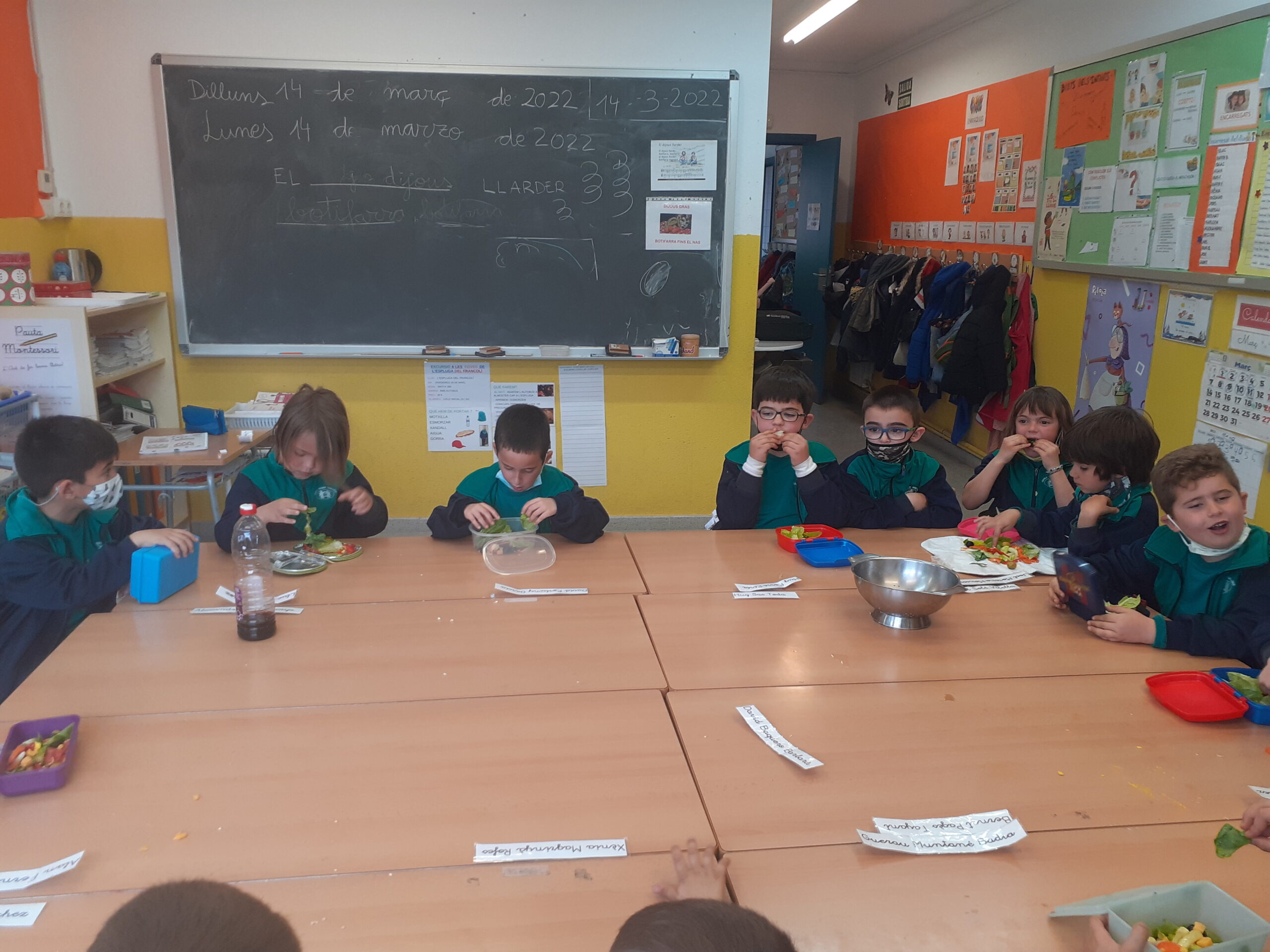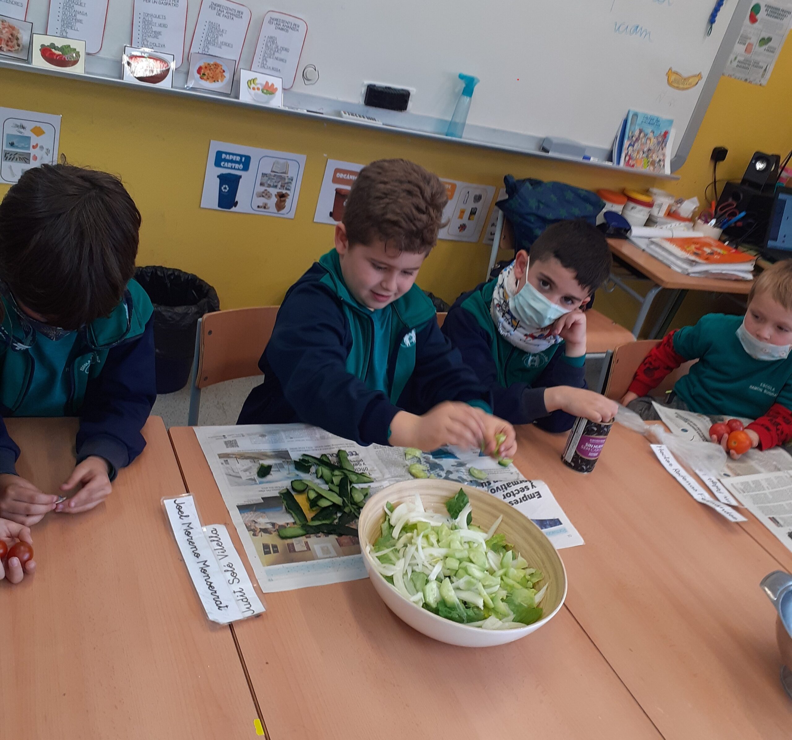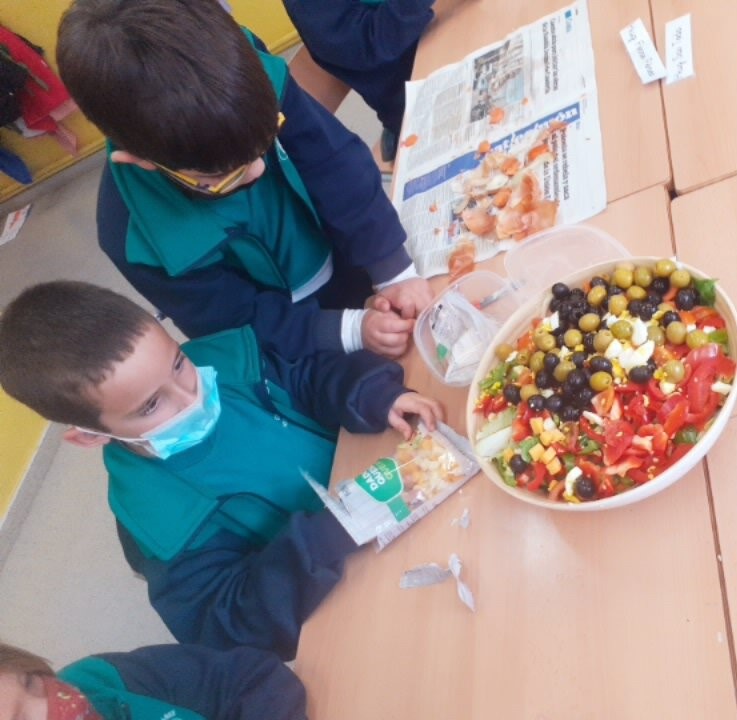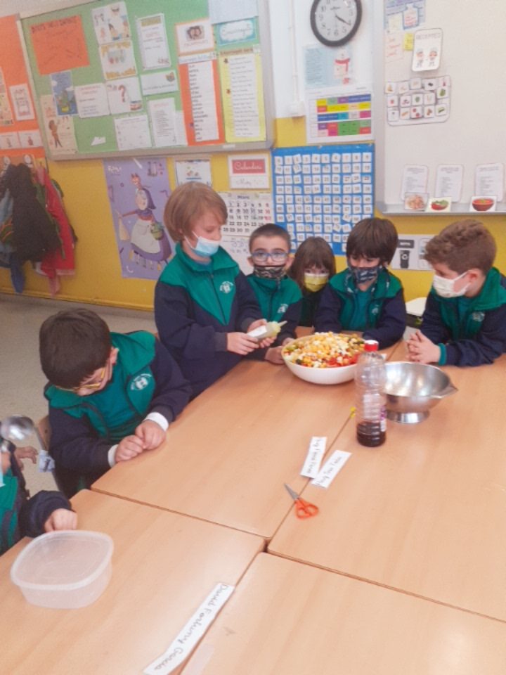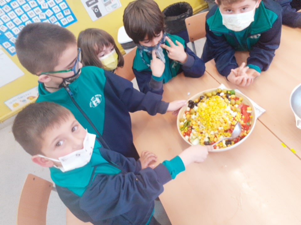A la classe de primer volem fomentar el menjar saludable, el consum de proximitat i la importància de la cura de l’hort a l’escola. A partir de l’activitat de l’hort, i amb l’ajuda de la Sandra Badia, la mama del Guerau, hem confegit diverses activitats. Entre d’altres, us explicarem que hem treballat diferents tipus d’amanides i hem jugat amb els seus ingredients. Cadascú ha pensat i confegit la seva recepta, però entre tots, també hem aconseguit fer, una de ben saborosa. Aquí us deixem una mostra del que hem arribat a fer i tastar… !!! Ummm !!
