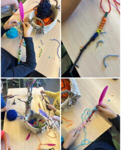Amb pals del bosc i inspirant-nos en els colors i les textures de la tardor, els hem decorat al nostre gust amb pintura, llana i plomes. Hem gaudit molt combinant colors, fent línies, nusos i formes originals. Cada pal ha quedat diferent i únic, com nosaltres!