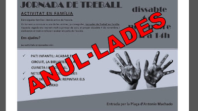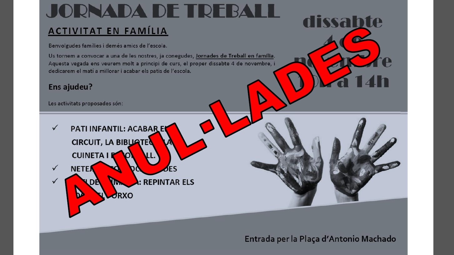 JORNADES DE TREBALL ANUL·LADES Feu un comentari / Per Mestres Machado / 3 de novembre de 2017 / Notícies Degut a les previsions meteorològiques hem decidit anul·lar les jornades de treball de demà dissabte.