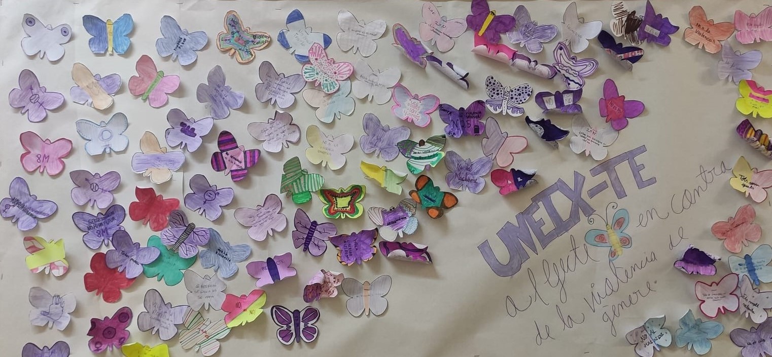Avui s’ha treballat el Dia Internacional per l’Erradicació de la Violència vers les Dones. Després de parlar, intercanviar idees i debatre una mica sobre aquest tema, tot l’alumnat ha pintat i escrit una paraula que representi aquest dia a una papallona. Us mostrem com han quedat després de penjar-les al passadís perquè tothom les pugui veure: