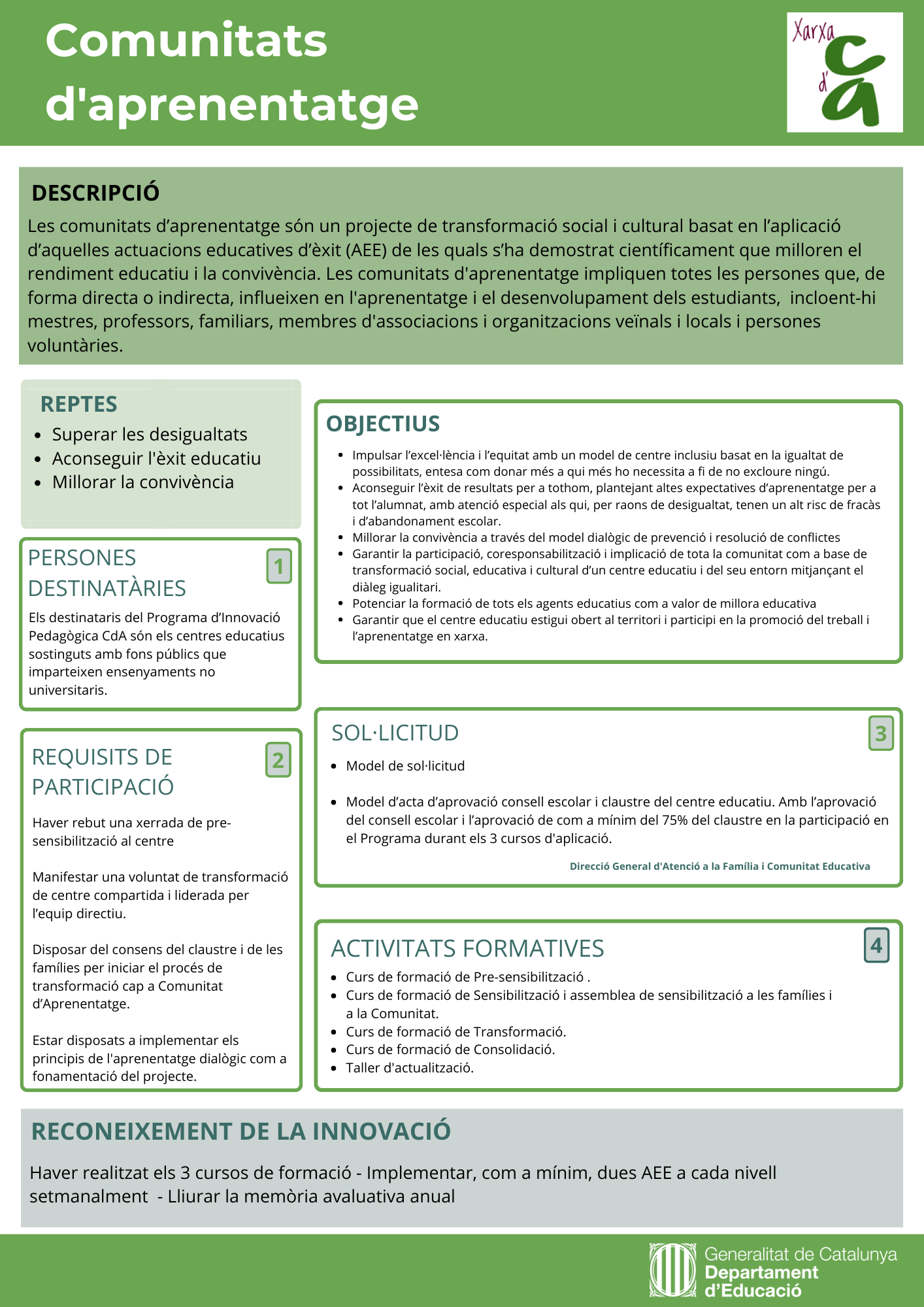 Les comunitats d’aprenentatge són un projecte de transformació social i cultural basat en l’aplicació d’aquelles actuacions educatives d’èxit (AEE) de les quals s’ha demostrat científicament que milloren el rendiment educatiu i la convivència. Les comunitats d’aprenentatge impliquen totes les persones que influeixen en l’èxit educatiu dels estudiants, incloent-hi mestres, professors, familiars, membres d’associacions i organitzacions veïnals i locals i persones voluntàries.
