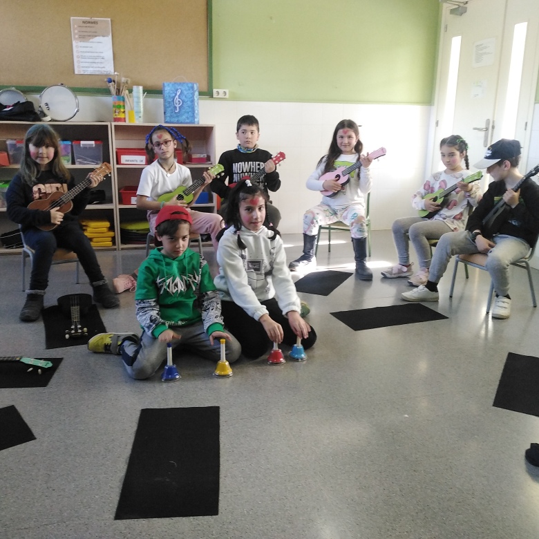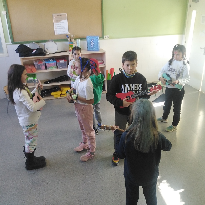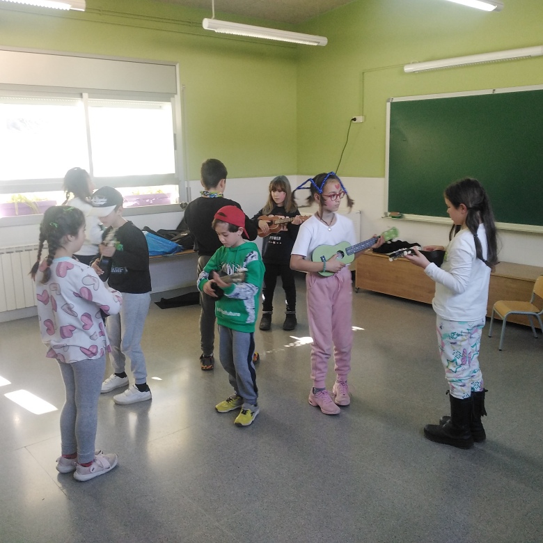 Aquest curs continuem amb les sessions d’Ukelele. Els mitjans i els grans de l’escola estem començant a aprendre acords, a coordinar el ritme de l’Ukelele amb el moviment corporal i en ho passem molt bé tocant aquest instrument.