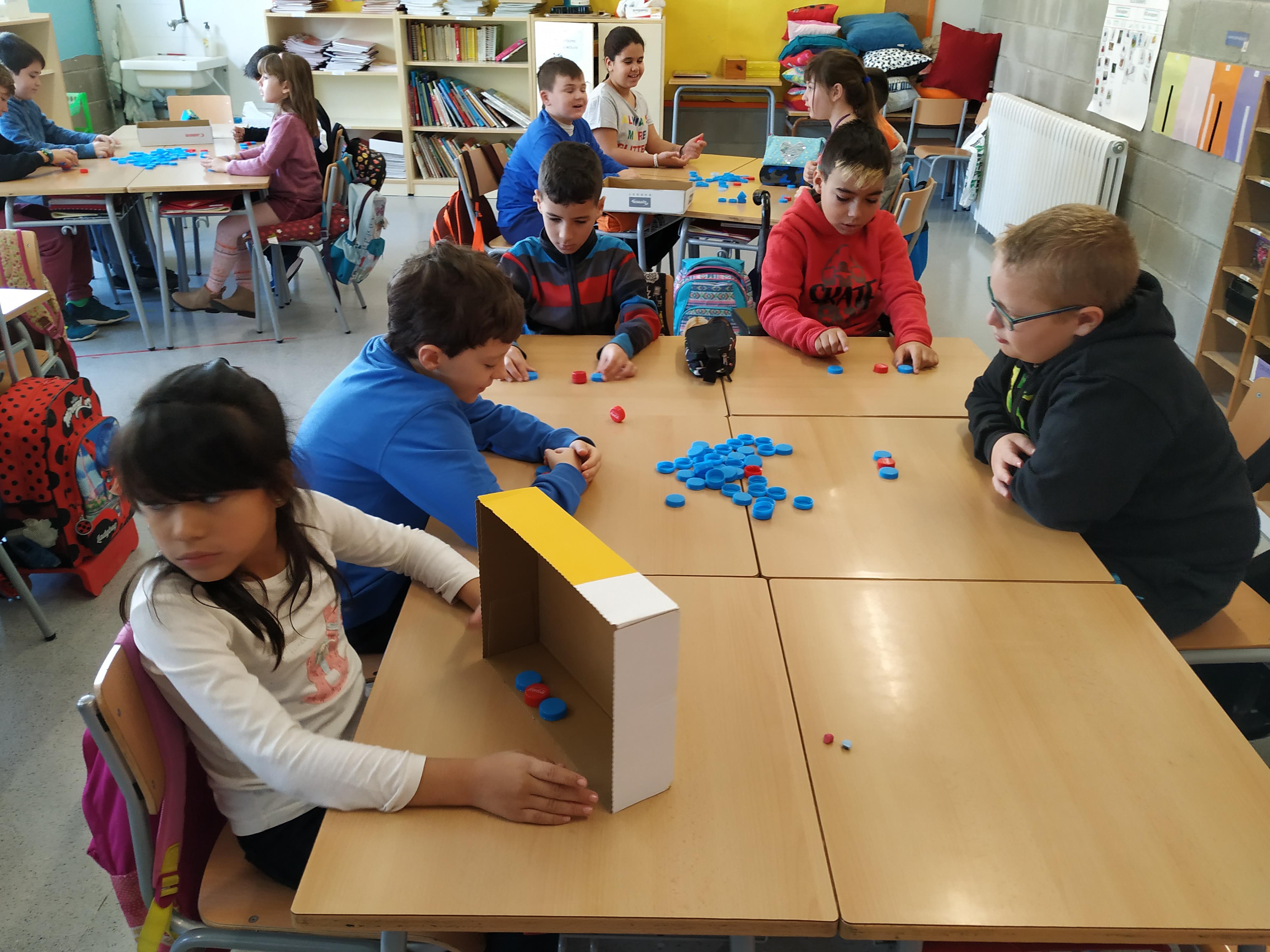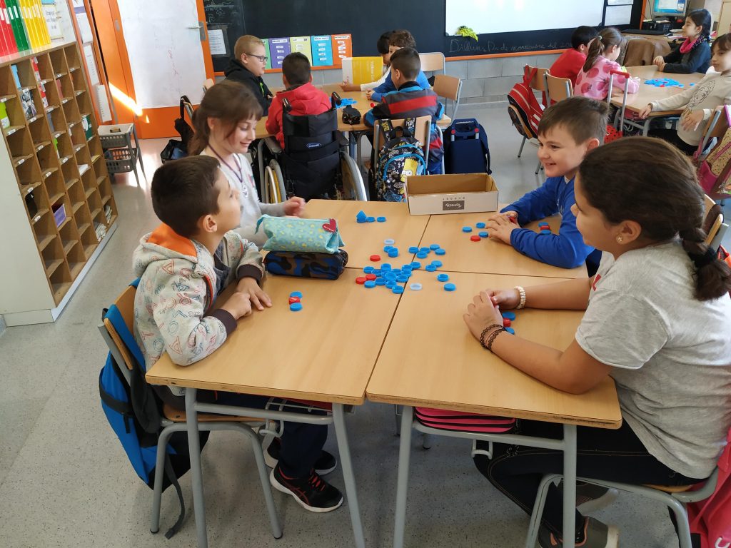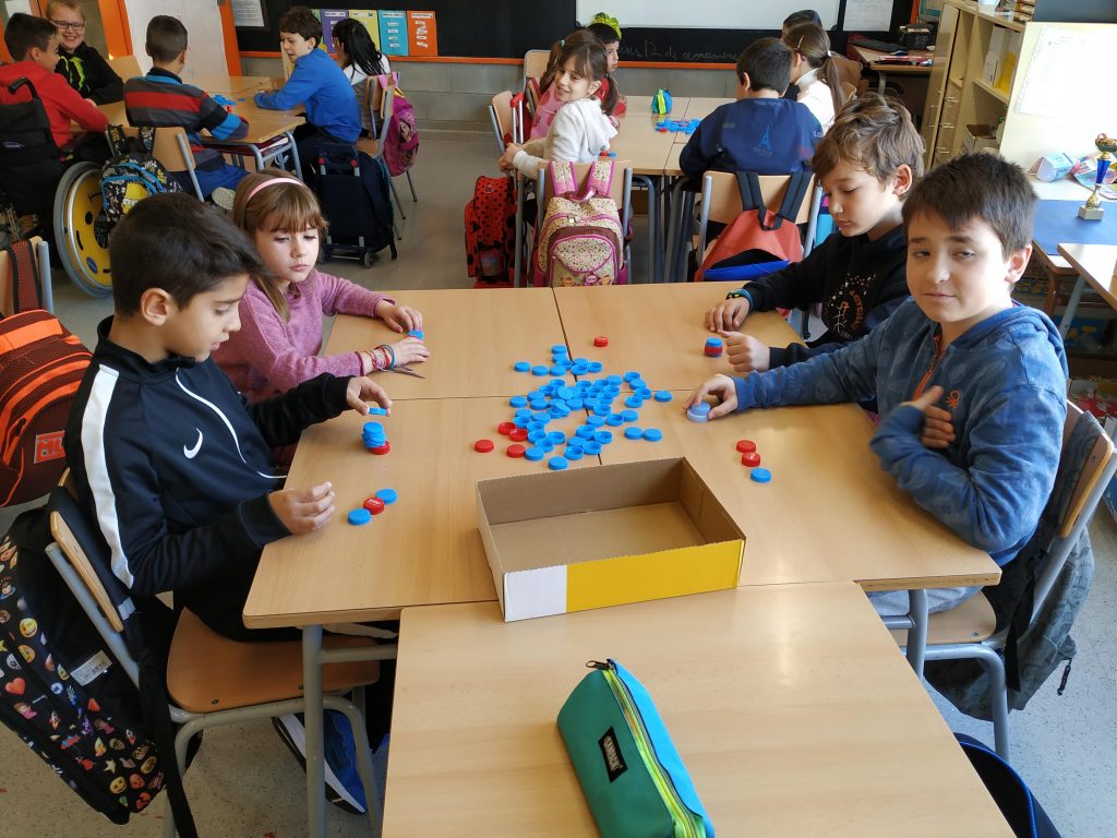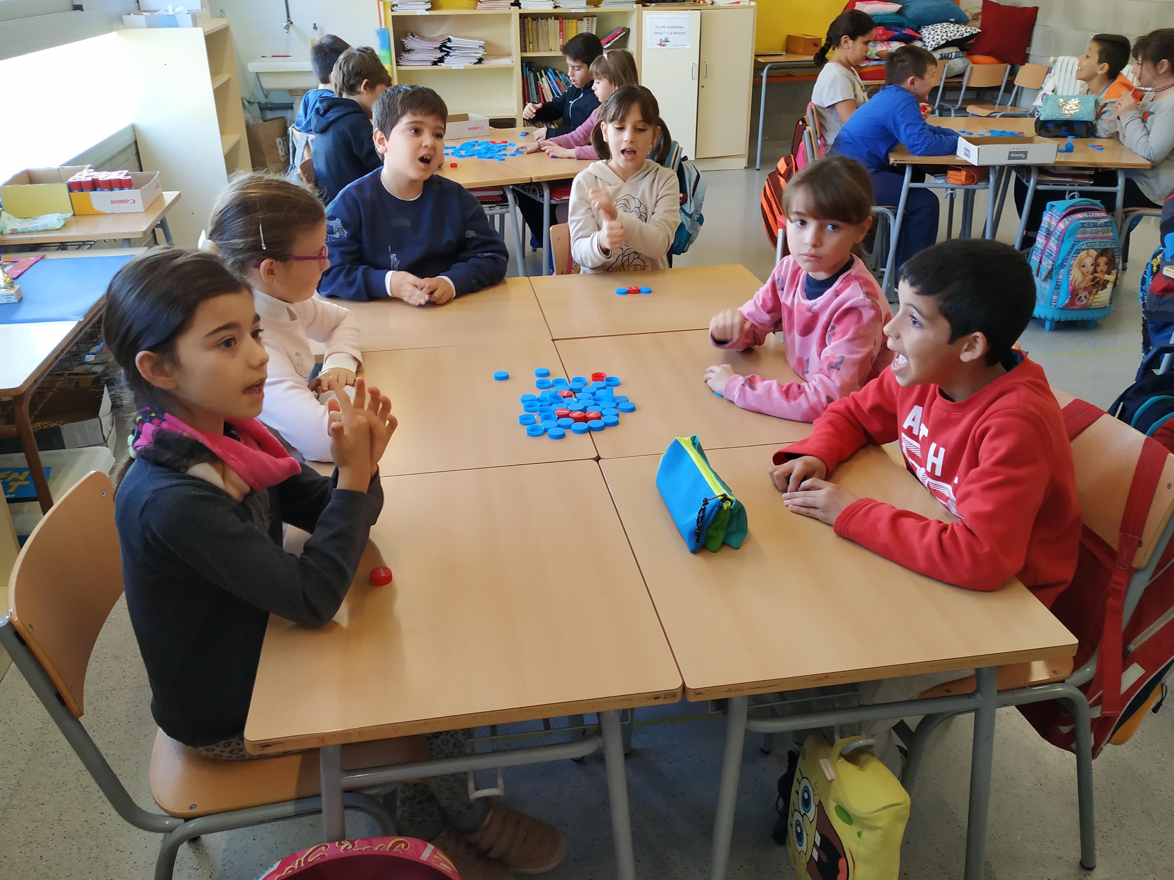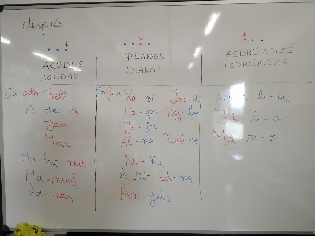 Els taps blaus representen les síl·labes àtones, i els taps vermells la síl·laba tònica. L’Àngels, la nostra mestra, ens diu una paraula i nosaltres piquem quants cops de veu té, i col·loquem els taps segons les síl·labes.
