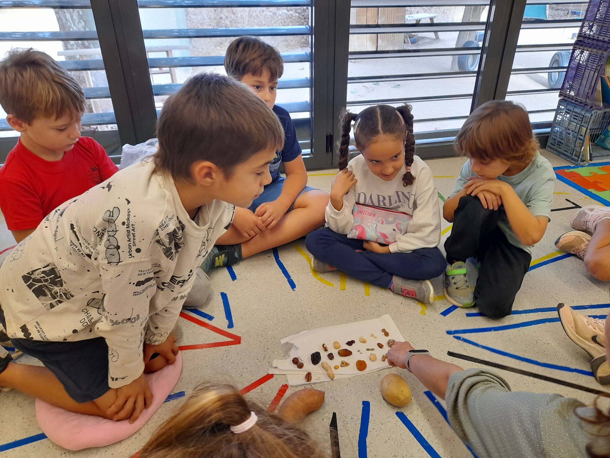 També vam poder observar tota una varietat de fruits secs que ens va portar l’Eduard Hilari, moltes gràcies Eduard! A més, vam descobrir que entre els fruits secs i la fruita dessecada, s’hi amaga un altre TUBERCLE com la patata o el moniato. Aquí teniu la foto (la Pilar l’està assenyalant). A veure si descobriu com es diu!! Una pista…se’n fa l’orxata!