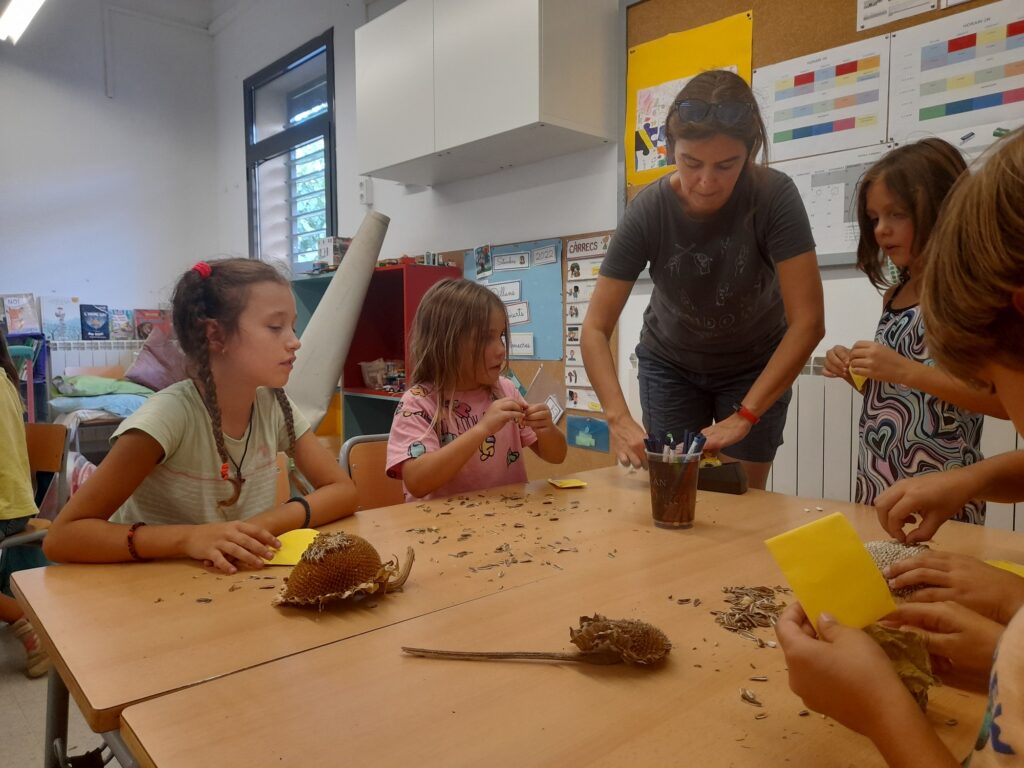 Quina il·lusió que ens ha fet tornar de vacances i trobar els gira-sols que vam sembrar a l’abril, ben grans i crescuts, i amb les pipes a punt per collir! El primer dia d’hort hem anat a recollir els gira-sols, i cadascú s’ha pogut emportar una petita bosseta amb unes quantes pipes. Ja sabeu que les podeu torrar o bé menjar directament, o si voleu, guardar per sembrar a la primavera i així seguir tenint més gira-sols, i més pipes!