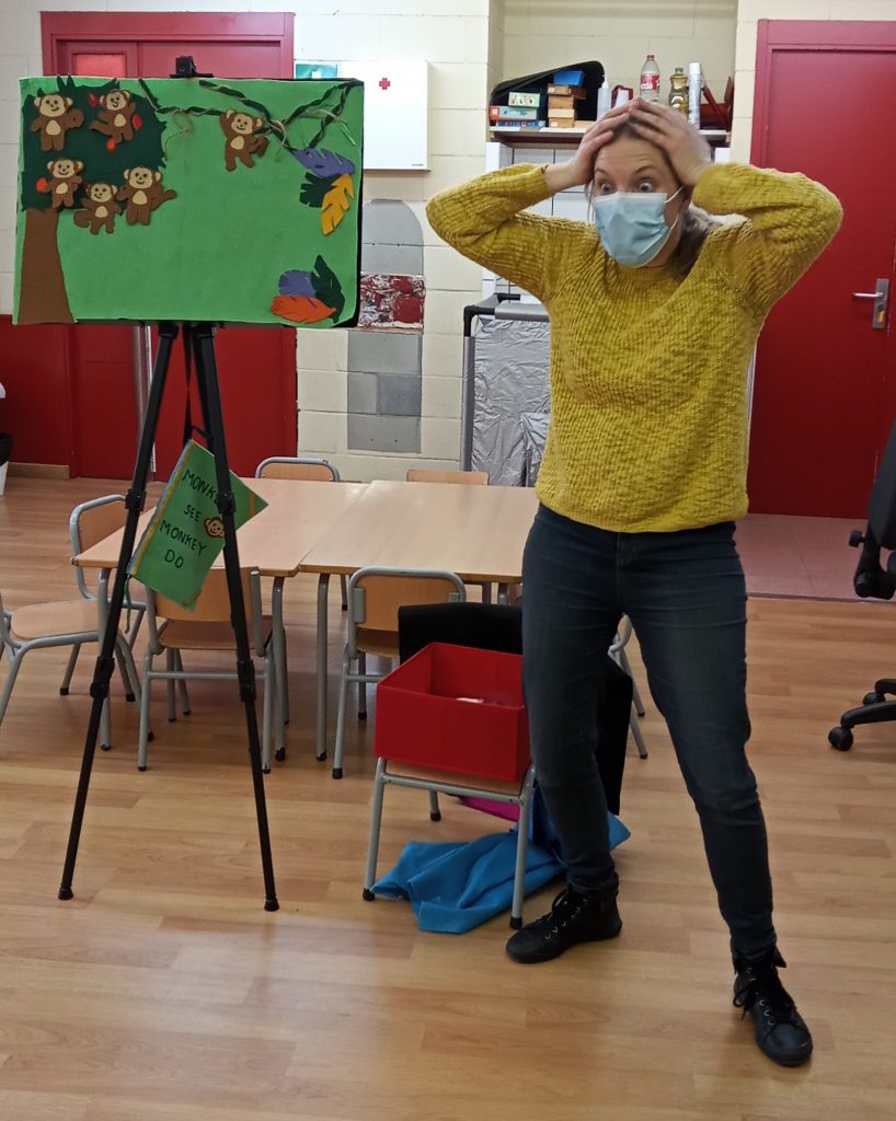 Avui hem gaudit durant una estona al matí de la presència d’una contacontes excepcional, la Jenny, que ens ha delectat amb un parell de contes en anglès a cadascuna de les aules d’Infantil: Llevant, Ponent, Tramuntana i Migjorn. Els vostres fills i filles s’ho han passat d’allò més bé, escoltant atentament el que deien els personatges (Family and Monkeys) i com gesticulaven graciosament per fer-se entendre.