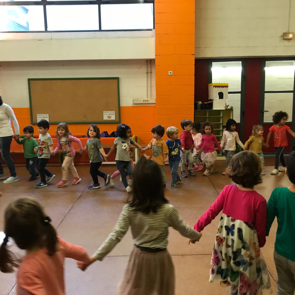 Aquest matí, els infants de P3, P4 i P5 ens hem reunit al gimnàs per compartir una estona plegats. Fa uns dies, els companys i companyes de P4 i P5 vam anar a la casa dels entremesos, i allà vam fer dos tallers: un de gegants i un altre de cançons i danses.