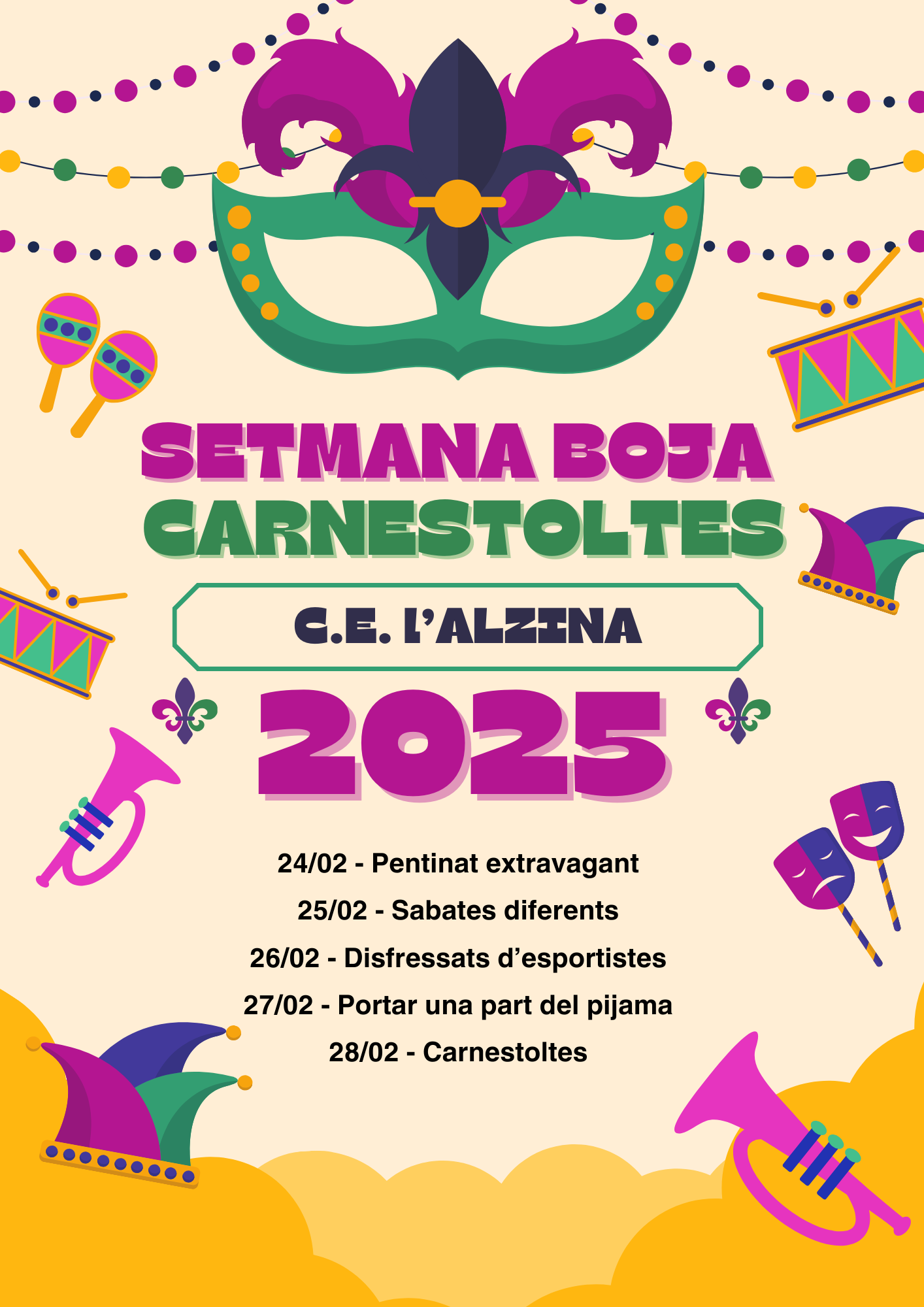 03/03/25Des del C.E. l’Alzina, hem decidit celebrar la setmana boja i el dia de Carnestoltes. Per fer-ho, cada dia de la setmana el rei Carnestoltes ha marcat certes premisses que els professors, alumnes, tècnics i coordinadors havien de complir: anar a les aules amb un pentinat esbojarrat, vestits d’esportistes, amb una sabata diferent i amb una part del pijama.