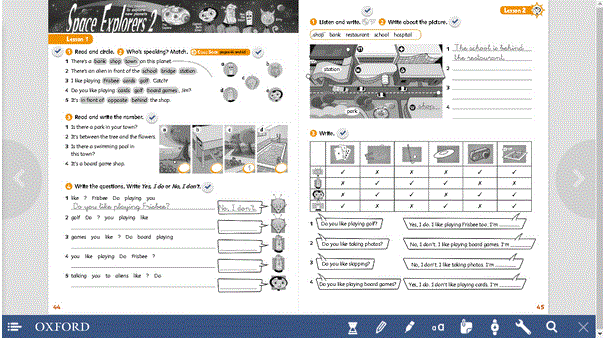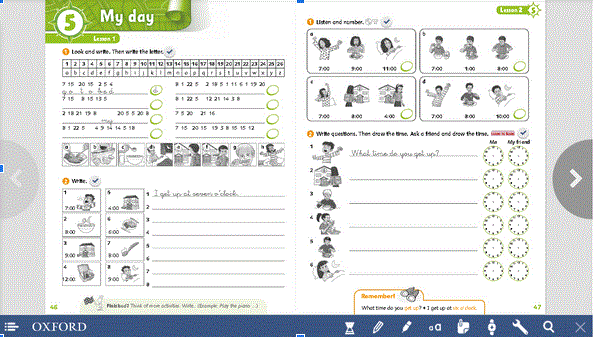 Escoltar i llegir la pàgina 46 del Class Book. Escolteu bé els àudios i repetiu-los en veu alta per familiaritzar-vos amb la pronunciació. Apunteu en un full quines imatges es descriuen a l’activitat 2. Feu-me arribar les respostes amb els deures. Així és com veureu la pàgina al llibre digital.