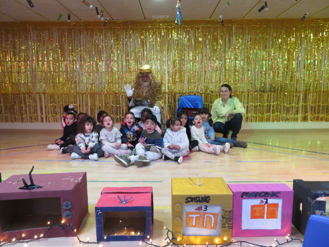 El divendres va venir la Mònica a la nostra classe i ens va dir que el Patge Reial havia vingut a l’escola! Ens vam emocionar molt davant d’aquesta gran notícia i vam agafar les cartes que prèviament havíem fet demanant quina joguina ens agradaria que els Reis d’Orient portessin a la nostra classe. Vam anar al menjador de l’escola i allà ens esperava el Patge Reial. Primer ens vam fer una foto amb ell i després cada infant li va donar una carta i ell a canvi li va donar una moneda de xocolata.