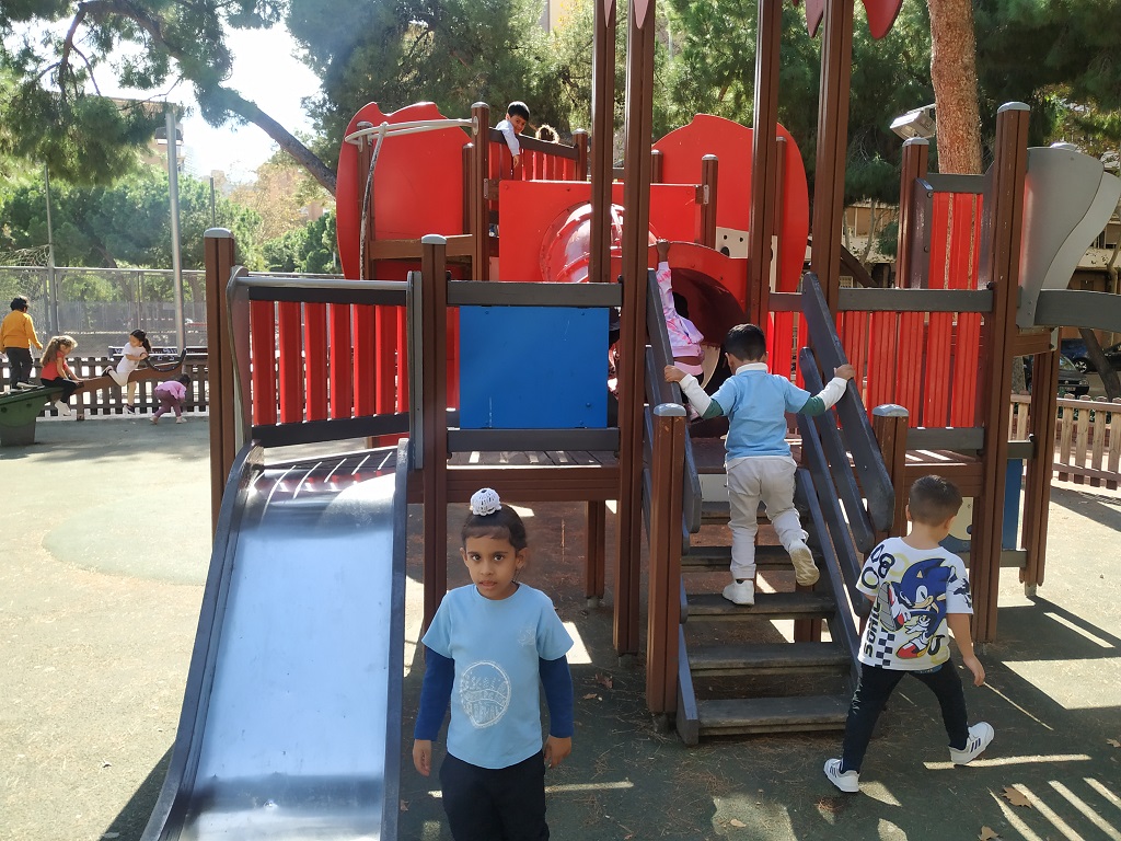 Hem anat caminant fins a un parc que hi ha molt a prop de l’escola. Hem baixat pels diferents tobogans i per uns túnels que hi ha, hem pujat al puja i baixa i hem baixat per una barra vertical que semblàvem els bombers quan els criden per anar a apagar un incendi. Ha sigut molt divertit!