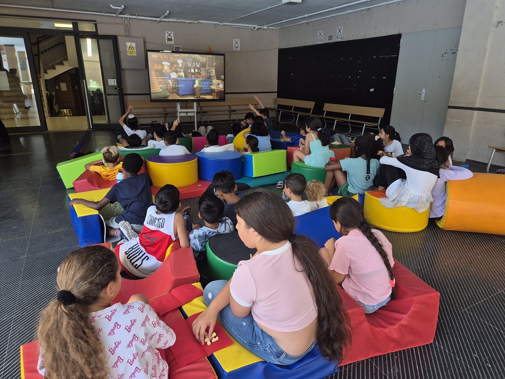 Aquest matí, els nens i nenes de Cicle Mitjà hem gaudit d’una sessió de cinema a la fresca al porxo de l’escola. Hem agafat els matalassos i el material de psicomotricitat i ens hem posat ben còmodes. Però en una sessió de cinema mai poden faltar… les crispetes! I un cop ho teníem tot preparat només ens quedava gaudir de “El bosc de Haquivaqui”, una pel·lícula molt musical i divertida.