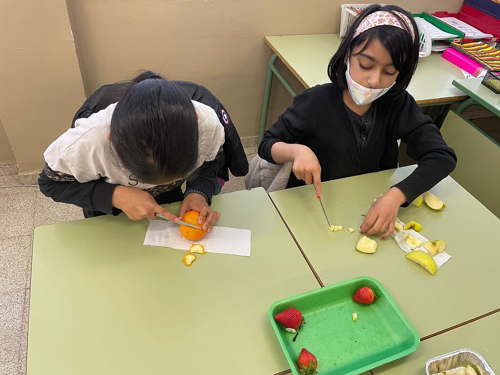 Aquesta setmana els Planethort hem après a tallar diferents fruites: taronja, poma, pera i maduixa. Durant la nostra investigació del Congrés de Ciència ens hem adonat que malbaratem molta fruita al menjador i hem volgut posar-hi remei. Si tallem bé la fruita reduïm el malbaratament, ja que llencem menys quantitat. Un cop tallada la fruita vam aprofitar per fer-nos unes broquetes que estaven boníssimes. Mireu quina bona pinta!