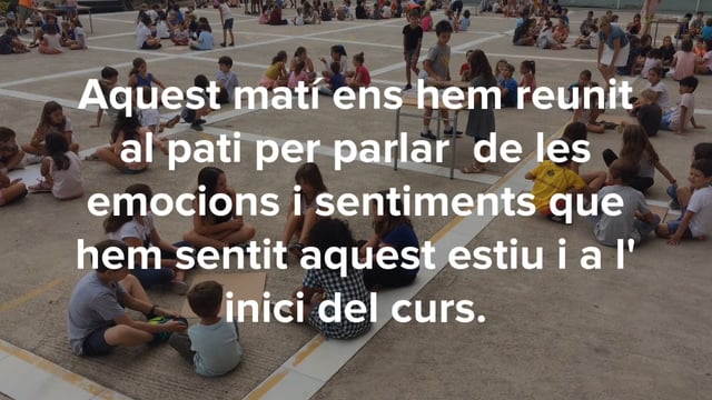 Dijous tot l’alumnat de primària es va trobar per compartir les emocions i sentiments d’aquest estiu i d’inici de curs. Ha estat una trobada molt agradable , ens hem conegut millor i ens hem adonat que hem passat un bon estiu i que estem contents de tornar a l’escola.