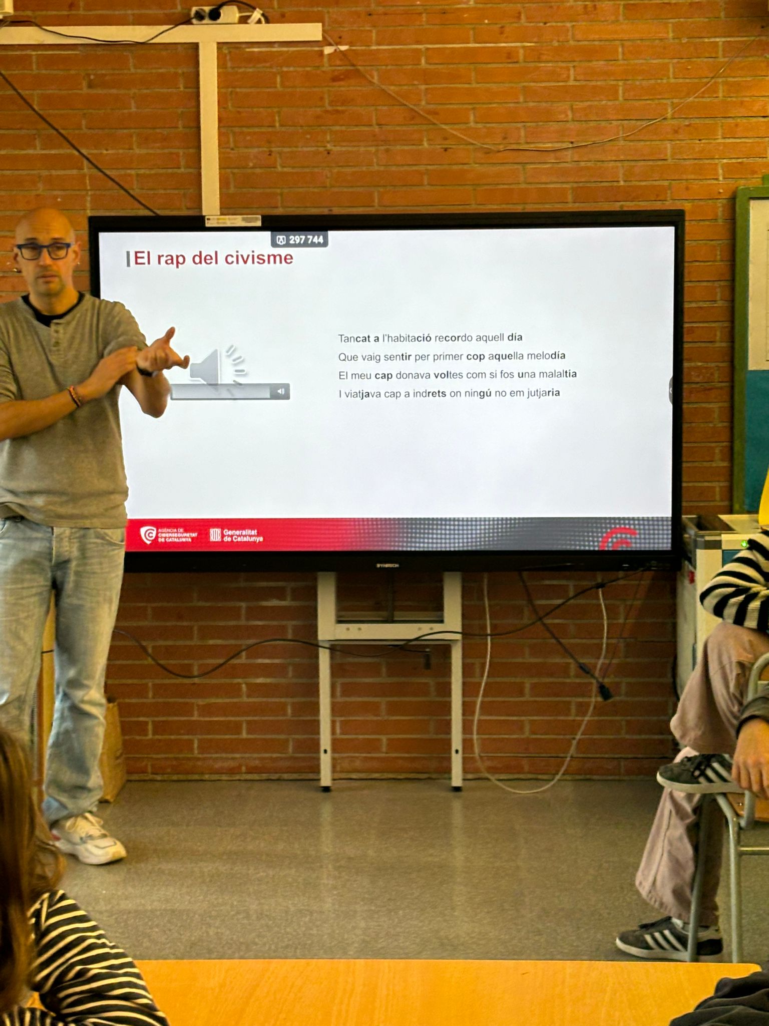 Amb els nois i noies de 6è va abordar el tema de les xarxes socials i l’alumnat va acabar inventant-se un rap.