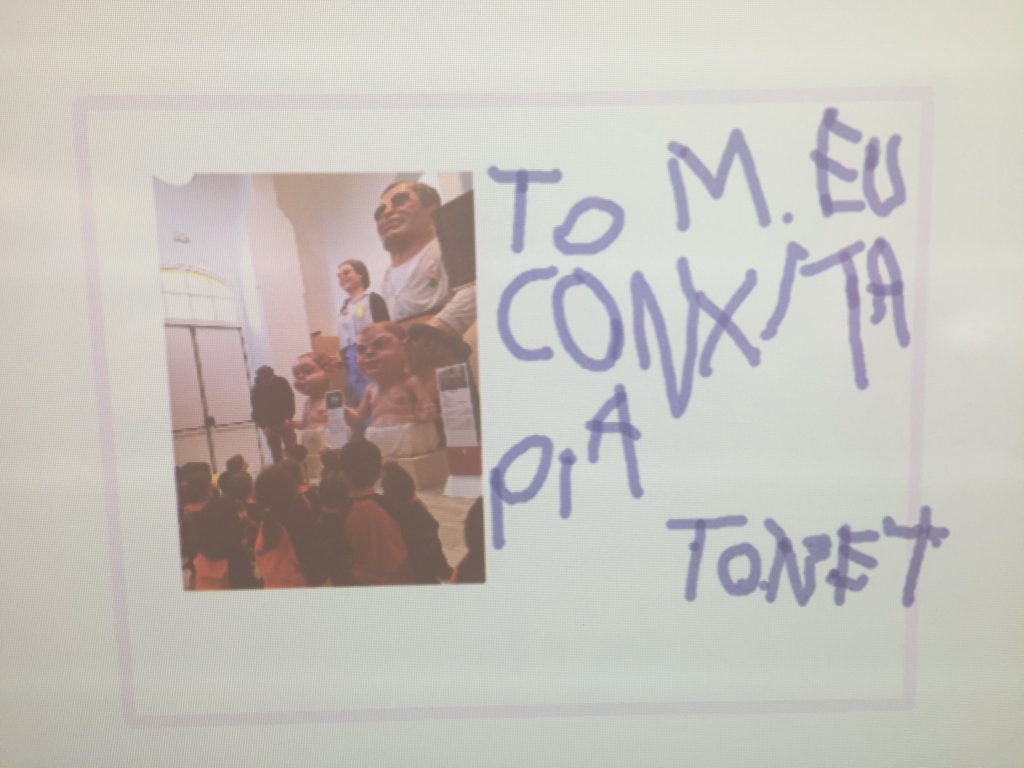 PROJECTE DE LA GEGANTONA PIA: Escribim els noms de la Família de la Pía? Feu un comentari / Per Escola Dolors Martí / 18 de març de 2018 / I3 Aquests dies estem molt engrescats en fer lletres i seguir aprenent. És per això que vam anar a la pissarra digital i una a una vam escriure entre tots els noms dels 4 membres de la família de la nostra gegantona. Ens encanta treballar amb la PDI!