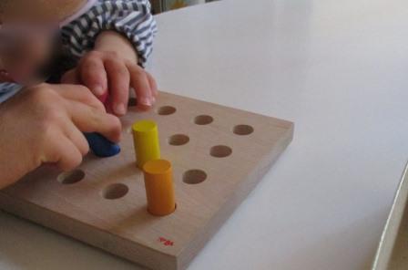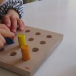 Utilitzem material elaborat per nosaltres amb objectes d’ús comú, com pot ser posar taps de plàstic o palets de fusta en un recipient a través d’una ranura, però també jocs educatius que ens serveixen pel treball manipulatiu i alhora per millorar la percepció i identificació de formes i colors, i l’aparellament seguint aquests criteris.
