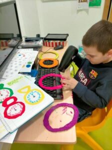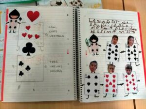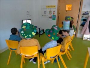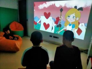 També hem treballat el desenvolupament de les habilitats cognitives, com l’atenció, la concentració i la memòria. Cada dia escoltem i mirem atentament el conte i cançons asseguts davant de l’ordinador i, a base de repeticions, aprenem alguns dels fragments que més ens agraden, com quan l’Alícia persegueix al conill blanc, quan cau dins el forat o quan es troba a la reina de Cors…