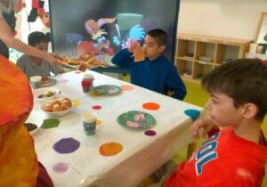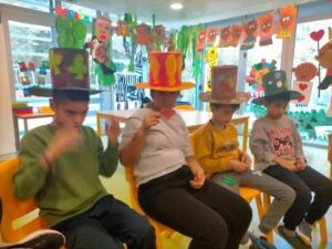 “Cada dia és una oportunitat per celebrar” i per això una activitat ben motivadora ha estat la recreació de la “festa del NO aniversari” on els personatges del conte celebren que no és l’aniversari de ningú. Nosaltres hem preparat una gran festa amb invitacions i amb una taula ben guarnida. Hem menjat pastissos i hem begut té amb les tasses i teteres que hem confeccionat retallant, enganxant i pintant molt pacientment. En aquesta activitat volem agrair la participació de les famílies que han col·laborat activament portant alguns dels productes que hem necessitat pel nostre banquet.