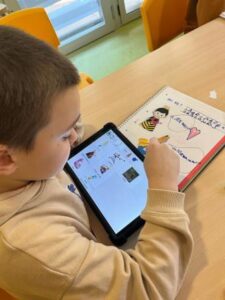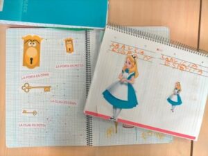 En les llibretes veiem reflectit el treball de comunicació, de lectoescriptura i de grafismes diari. Treballem el vocabulari i l’estructuració de frases basant-nos en fragments del conte i de les cançons que escoltem cada dia. La logopeda ens ha ajudat a introduir-ho i a treballar en les sessions específiques, amb el programa asterics grid de la tauleta. També hem buscat materials i fitxes per treballar conceptes matemàtics molt presents en el conte: “gran-petit”, seriacions, exercicis de relació, d’atenció, etc. sempre amb l’Alícia com a protagonista.