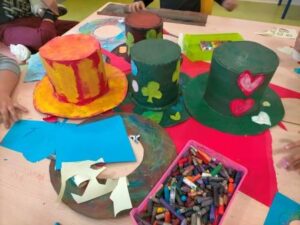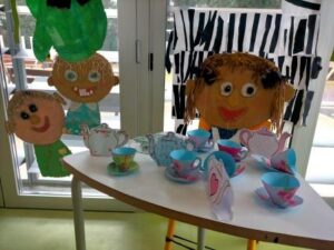 Alguns dels personatges més famosos que apareixen en aquesta novel·la de Carroll són: el Conill Blanc, el Barreter, el Gat de Cheshire, les cartes o la Reina de Cors, els quals nosaltres hem arribat a conèixer recreant-los a l’aula tot exercitant les nostres habilitats artístiques i utilitzant diferents materials i tècniques plàstiques diverses. Les activitats manipulatives ens ajuden a millorar el desenvolupament motor i la motricitat fina, essencial per executar tasques com: escriure, tallar amb tisores o manipular petits objectes.