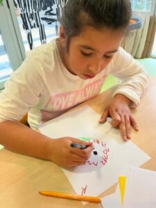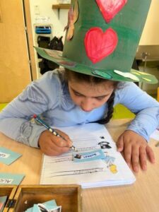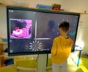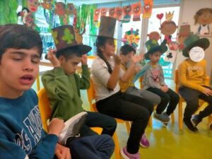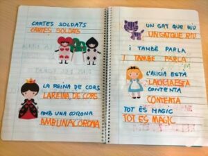 També hem treballat el desenvolupament de les habilitats cognitives, com l’atenció, la concentració i la memòria. Cada dia escoltem i mirem atentament el conte i cançons asseguts davant de l’ordinador i, a base de repeticions, aprenem alguns dels fragments que més ens agraden, com quan l’Alícia persegueix al conill blanc, quan cau dins el forat o quan es troba a la reina de Cors…