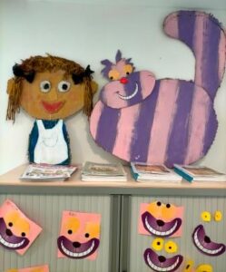 Alguns dels personatges més famosos que apareixen en aquesta novel·la de Carroll són: el Conill Blanc, el Barreter, el Gat de Cheshire, les cartes o la Reina de Cors, els quals nosaltres hem arribat a conèixer recreant-los a l’aula tot exercitant les nostres habilitats artístiques i utilitzant diferents materials i tècniques plàstiques diverses. Les activitats manipulatives ens ajuden a millorar el desenvolupament motor i la motricitat fina, essencial per executar tasques com: escriure, tallar amb tisores o manipular petits objectes.