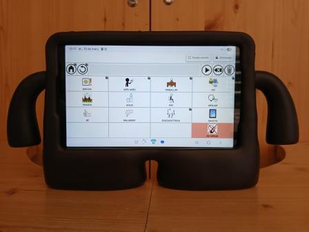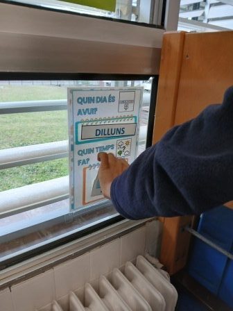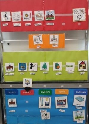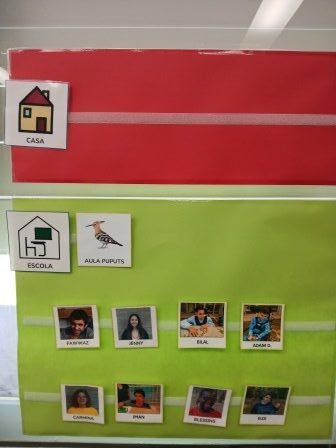 En el panell que tenim a l’aula diferenciem CASA i ESCOLA d’aquesta manera quan es fa la salutació individual podem saber quin company/a ha vingut a l’escola. Amb les fotografies o tauleta comunicativa identifiquem els companys/es presents.