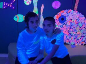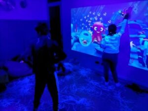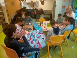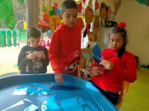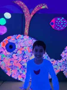 L’activitat més visual i atractiva l’hem fet a la sala dels somnis, on amb l’ajuda de les pintures fosforescents i de la llum ultravioleta, ens hem submergit en el mar dels peixos de tots colors i ens hem convertit en peixets blancs amb l’escata de colors del nostre peix irisat.