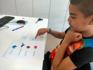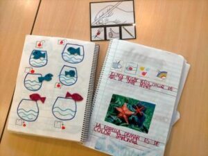 Amb el fil conductor del peix Irisat hem avançat en la comprensió de preguntes del tipus: Qui és? On és? Què fa?. L’ús de la tauleta, amb els pictogrames que ens va afegint la logopeda, ens ajuda a anar entenent aquestes qüestions de resposta oberta. Sempre ens resulta motivador obrir les nostres llibretes i carpetes i veure com hem anat treballant i aprenent sobre el tema!!