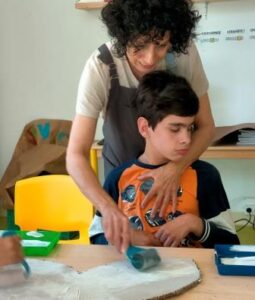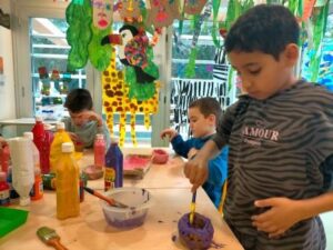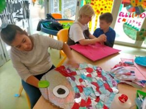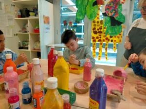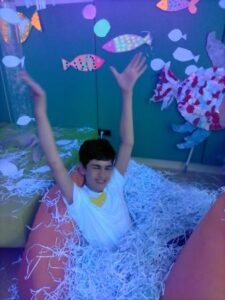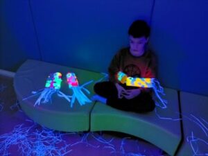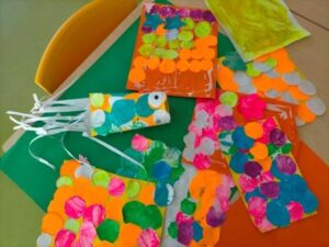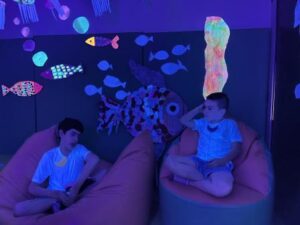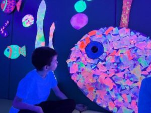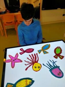 L’activitat més visual i atractiva l’hem fet a la sala dels somnis, on amb l’ajuda de les pintures fosforescents i de la llum ultravioleta, ens hem submergit en el mar dels peixos de tots colors i ens hem convertit en peixets blancs amb l’escata de colors del nostre peix irisat.