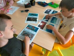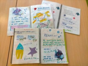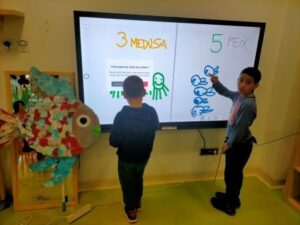 L’argument del conte ens ha permès treballar vocabulari del fons del mar, hem estudiat els noms dels peixos, els hem escrit i llegit tot practicant les nostres habilitats de lectoescriptura. A partir de la còpia, de la lectura i dels dictats de petits fragments hem anat memoritzant situacions del peix Irisat. També ens hem mogut pel Google i per les xarxes socials per obtenir informació i materials per aprofundir els aspectes relacionats amb el fons del mar.