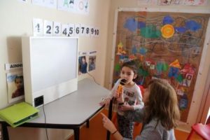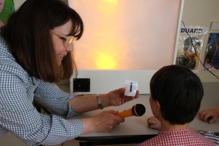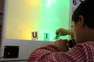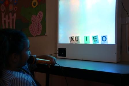 En la sessió de logopèdia grupal a l’aula 7 hem experimentat amb el panell de llum i so que s’il·lumina amb els sons vocàlics. És una manera lúdica i atractiva de treballar amb els alumnes que comencen a emetre so o les primeres paraules per anar-les modelant i reforçant alhora que afavoreix les emissions verbals tant qualitativa com quantitativament.