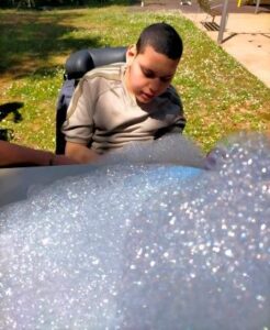 Seguint amb el projecte d’experimentació de textures, hem aprofitat aquests dies de calor per fer una activitat a l’aire lliure. Toquem l’escuma, ens refresquem els peus, sentim les vibracions de l’aparell. Han estat unes estones relaxants, divertides i refrescants.