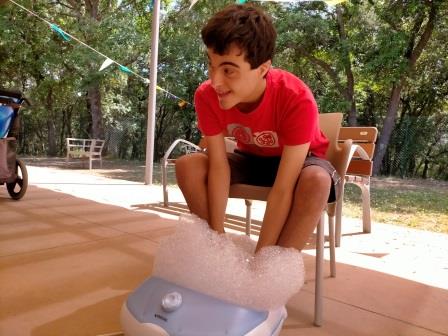 Seguint amb el projecte d’experimentació de textures, hem aprofitat aquests dies de calor per fer una activitat a l’aire lliure. Toquem l’escuma, ens refresquem els peus, sentim les vibracions de l’aparell. Han estat unes estones relaxants, divertides i refrescants.