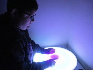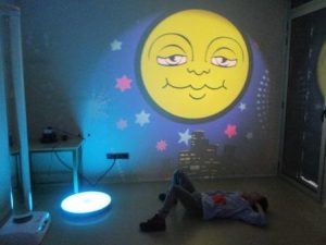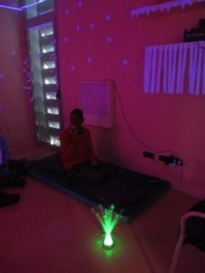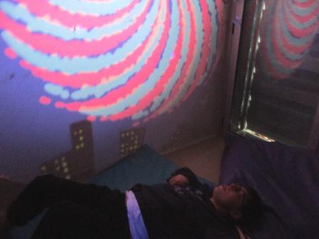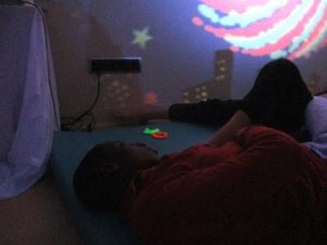Una de les activitats que ens està ajudant a aconseguir  centrar l’atenció i mantenir-la, alhora que relaxar-se, són les sessions a la sala d’estimulació visual. És un espai diferent de l’aula on poden seure o estirar-se al puf o a la màrfega. Mostren cert interès pels estímuls visuals, que són diversos i molt atractius, però sovint ho combinem amb l’ús d’aparells com el matalàs vibratori i altres de massatge, que permeten percebre sensacions que solen ser agradables per ajudar-nos a estar relaxats.