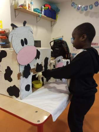 El següent animal que vam treballar va ser la vaca. A plàstica, reutilitzant capses de cartró, vam fer una vaca i un vedell. Aprofitant les estones de treball individual i amb vídeos, vam aprendre que de la vaca podem extreure llet; així que… ho vam fer a l’aula!! Vam ser autèntics grangers i vam munyir la nostra vaca.