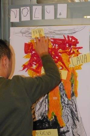 Per acabar l’activitat vam pintar entre tots un volcà, i hi vam escriure les diferents parts ( volcà, cràter, lava, colada, con, focus, fum ). S’ho van aprendre i sols van anar posant les etiquetes al lloc corresponent. Ho van fer super bé!